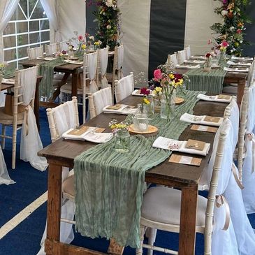 We offer a range of packages as well as full bespoke design, so whether you want a little help or full creative support, we’ve got you covered. We work with any budget and tailor every design to suit your vision. From the very first chat to the final set-up on the day, we’re there every step of the way, keeping things relaxed, fun, and stress-free while we bring your dream wedding to life.
